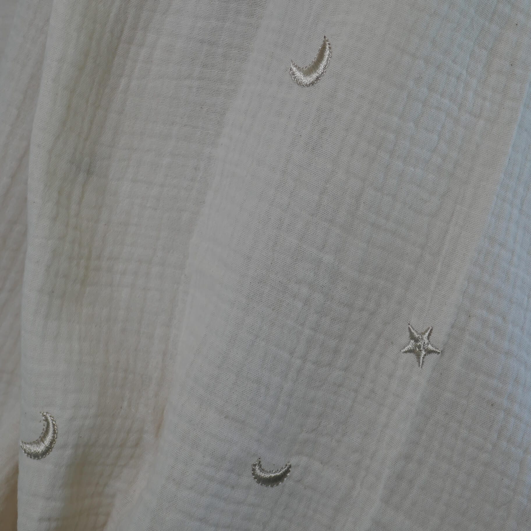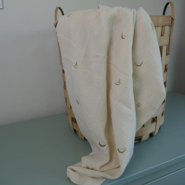 Deze hydrofiele doek (of swaddle) in de kleur ecru is voorzien van geborduurde maantjes en sterren. Het borduursel heeft een mooie beige/gouden kleur en voelt zacht aan, dus nog steeds heel geschikt om je kleintje mee af te drogen.