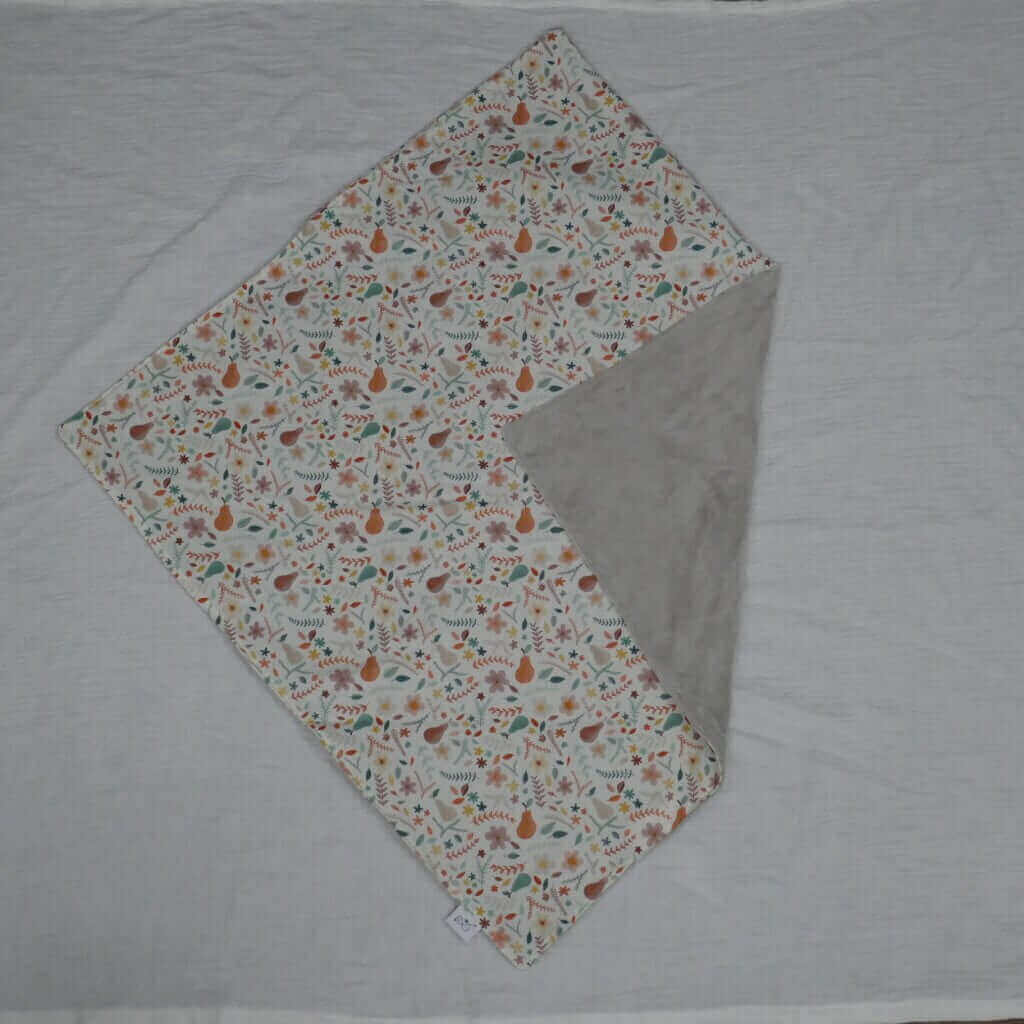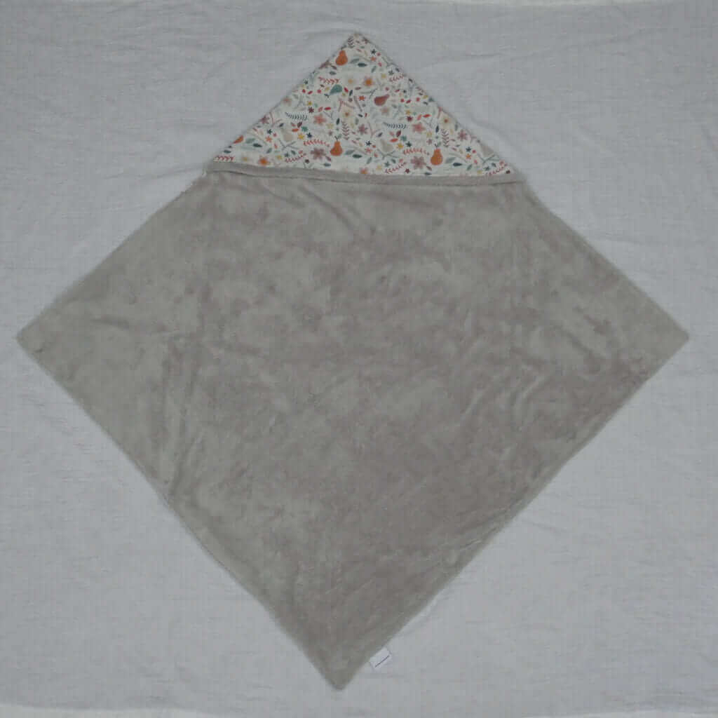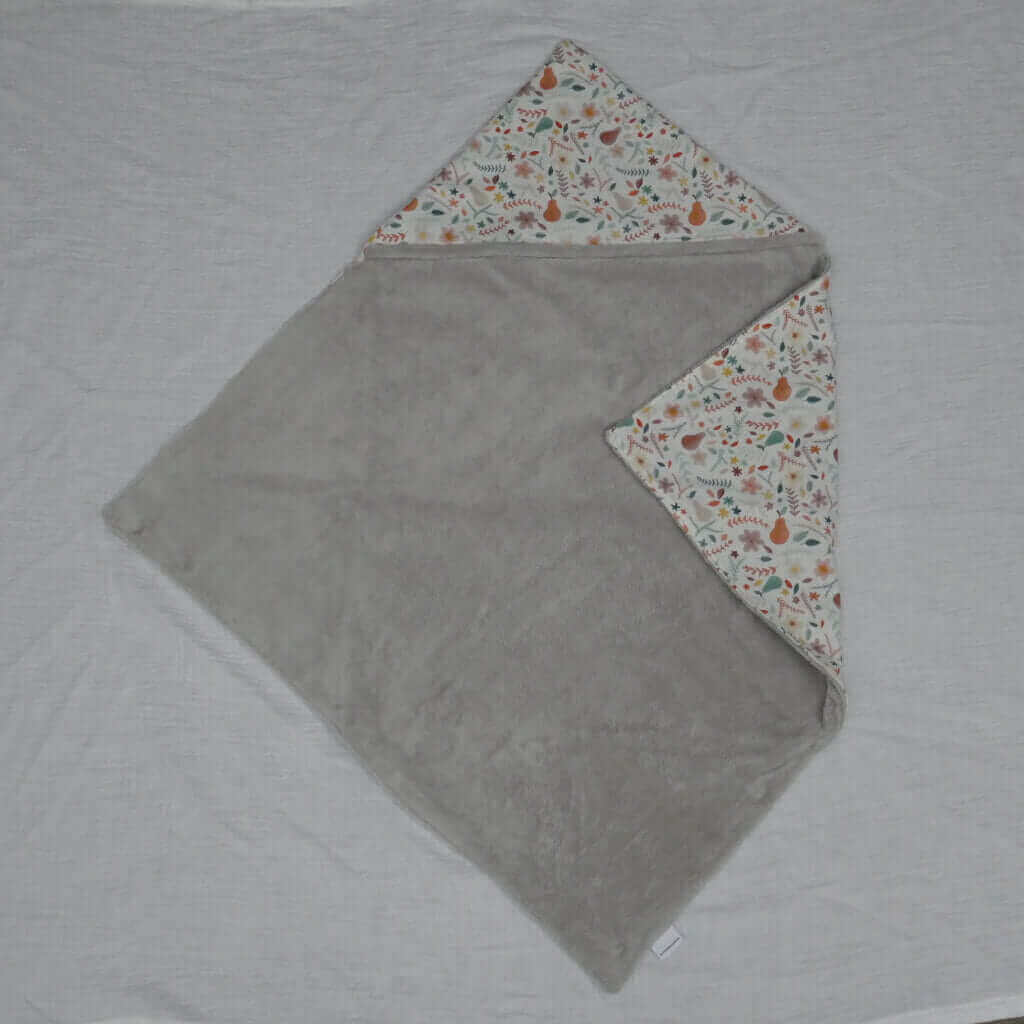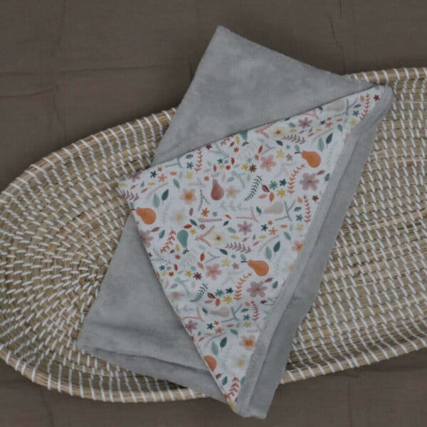 Heerlijk zachte en grote omslagdoek/badcape. De bovenzijde is van een zacht katoen met een vrolijk peren en bloesemprintje. De onderzijde is van een bamboe/katoen mix waardoor deze goed vocht opneemt, maar ook superzacht is. Deze omslagdoek is heerlijk om je kleintje in te wikkelen kort na de geboorte, maar ook nog lang te gebruiken na het badje/douchen!